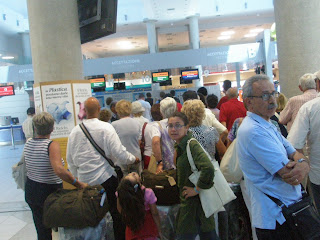 Waiting at the airport. Lines everywhere. No one moving. It turned out the computer system wouldn't allow seat assignments so there was a whole plane of people standing around until the agents just started processing everyone on a sit where ever you want basis. I roll my eyes and think, only in Italy. It must have been a madhouse at the gate!